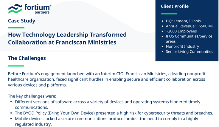 Before Fortium's engagement, a prominent healthcare organization faced significant operational disruptions, inefficiencies, and higher risks due to high turnover in its IT leadership.